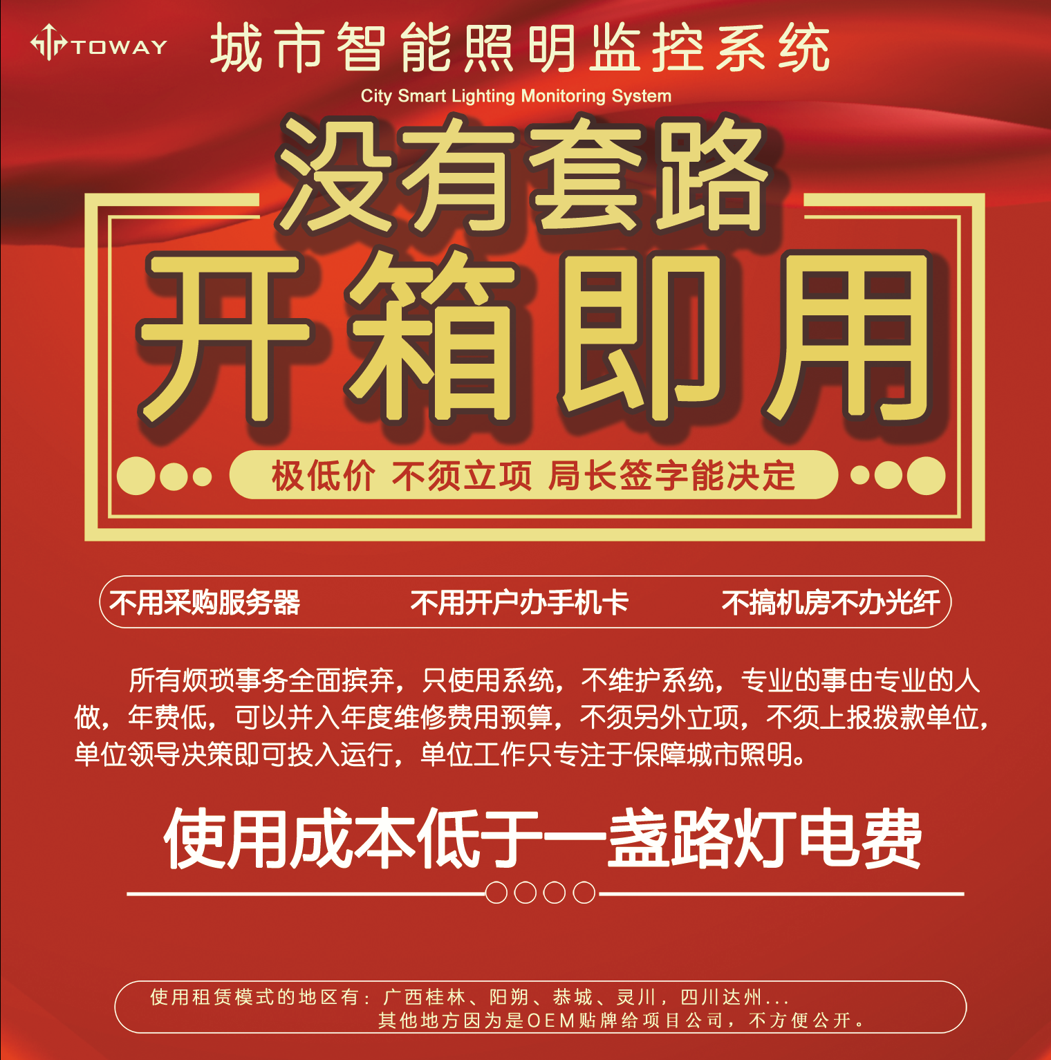 此方案對于一個縣城100臺路燈配電箱的體量,首年開支也只有三萬五千元,此后每年費用是兩萬五,本方案最大的優點就是費用低廉,這筆費用完全可以并入年度維護撥款中核銷。且不會有設備過保要重新采購的問題出現。